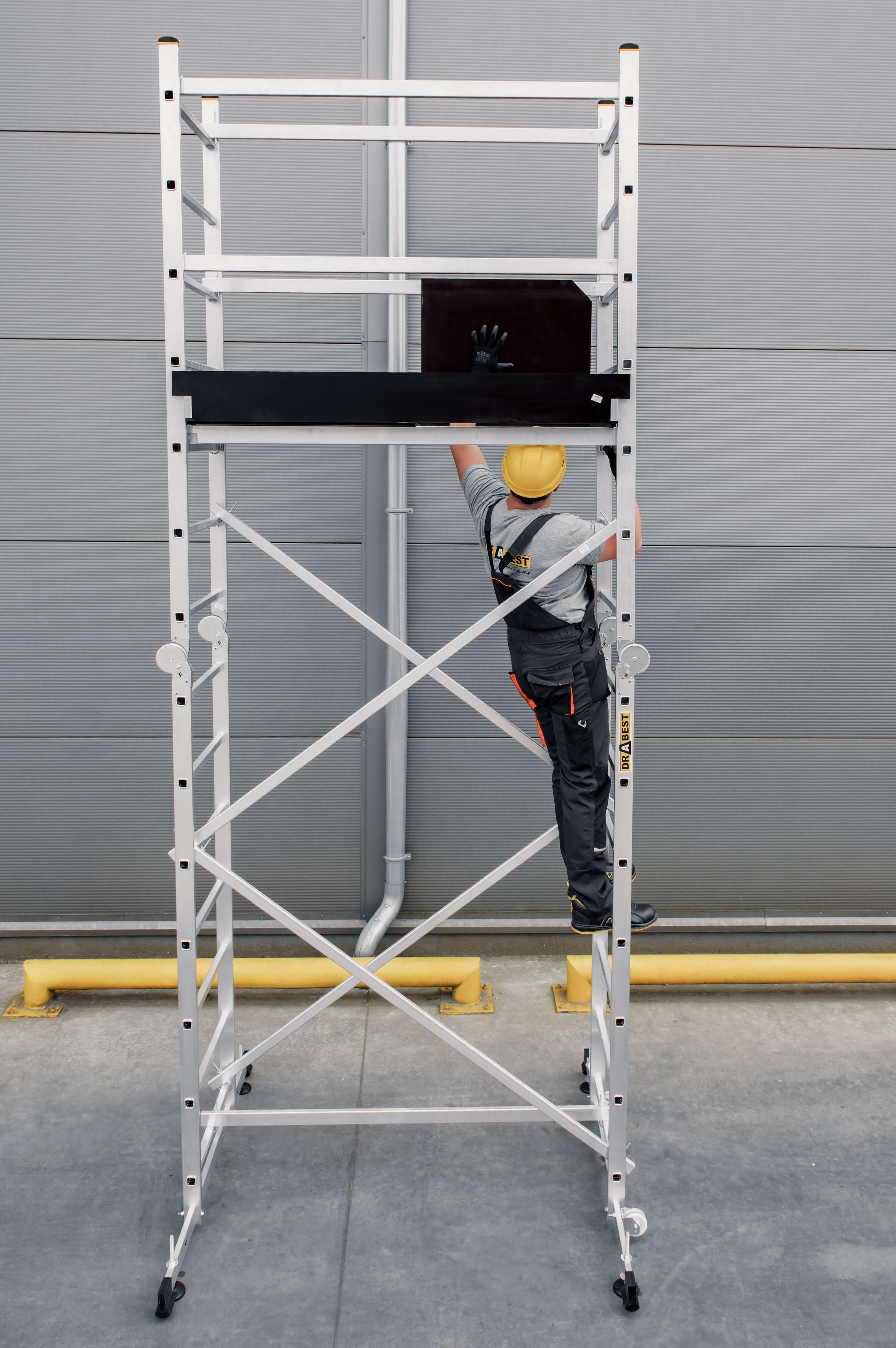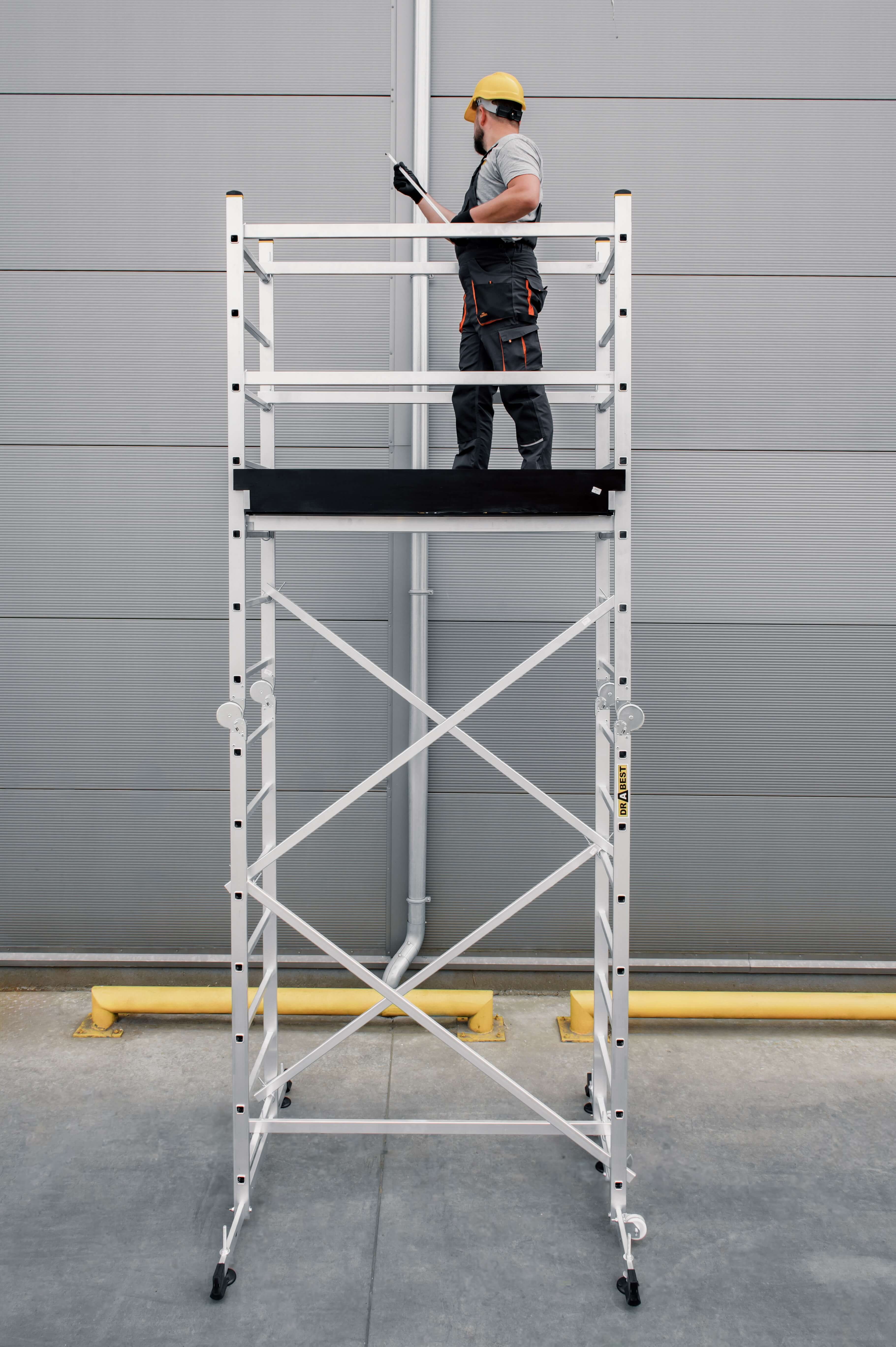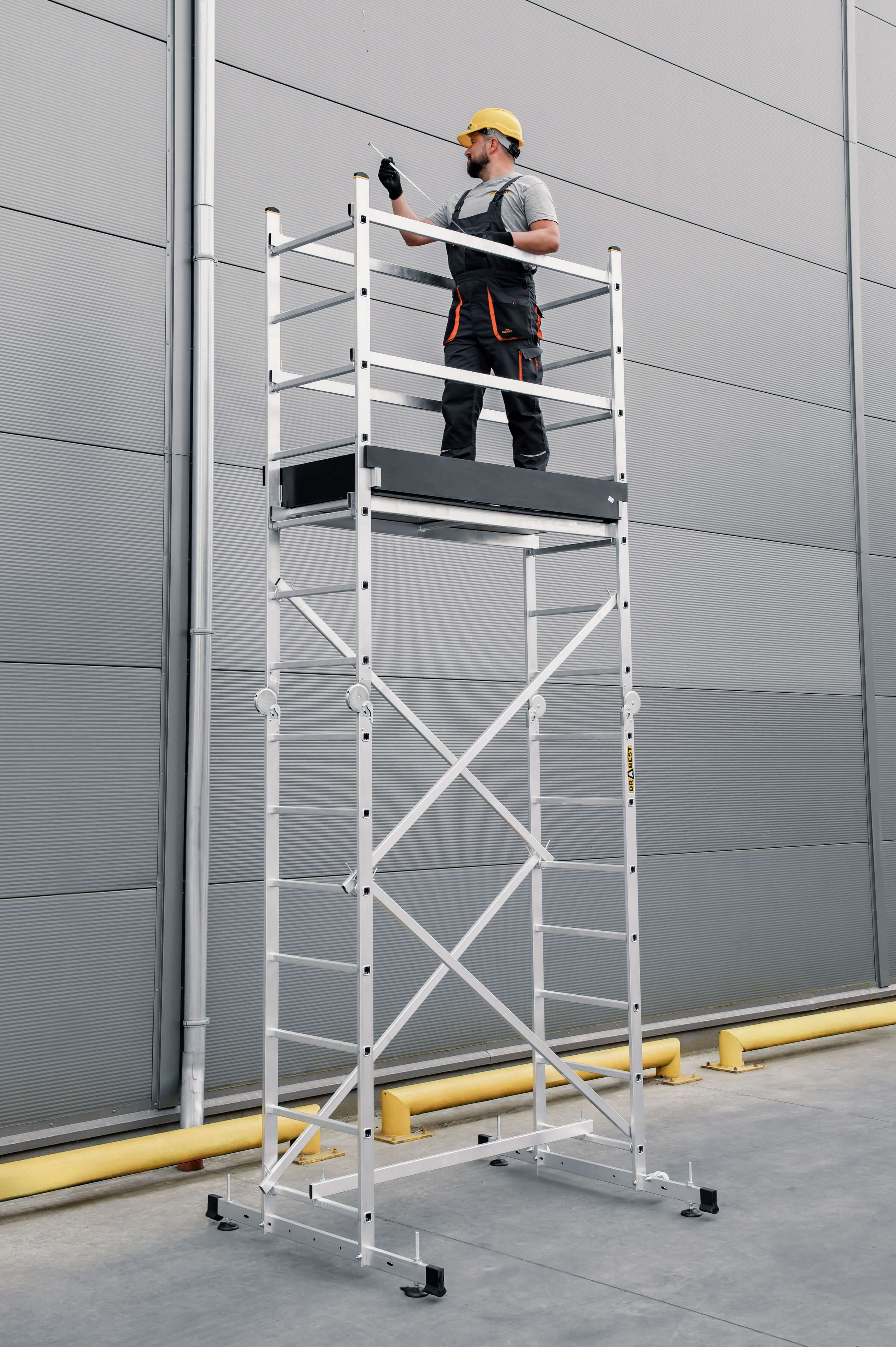 Das mobile Leitergerüst HECTOR ist eine ausgesprochene Mehrzweckkonstruktion. Neben seiner Funktion als Gerüst können seine Bestandteile auch als freistehende Leiter, als Anlegeleiter und als Arbeitsbühne verwendet werden. Dank der angebrachten Kunststoffräder können Sie das Gerüst problemlos überall hin transportieren. Ihre kompakte Größe im zusammengeklappten Zustand ist auch ein Vorteil für den Transport und die Lagerung. Effizientes Auf- und Zusammenklappen dank funktioneller Gelenke. Der Hector Gerüststabilisator ist beweglich, so dass Sie den Abstand zwischen Gerüst und Wand beliebig einstellen können, um bequem arbeiten zu können. Die Konstruktion des Gerüsts und alle seine Leiterkonfigurationen entsprechen vollständig der europäischen Norm EN 1004 für Sicherheit und Haltbarkeit.